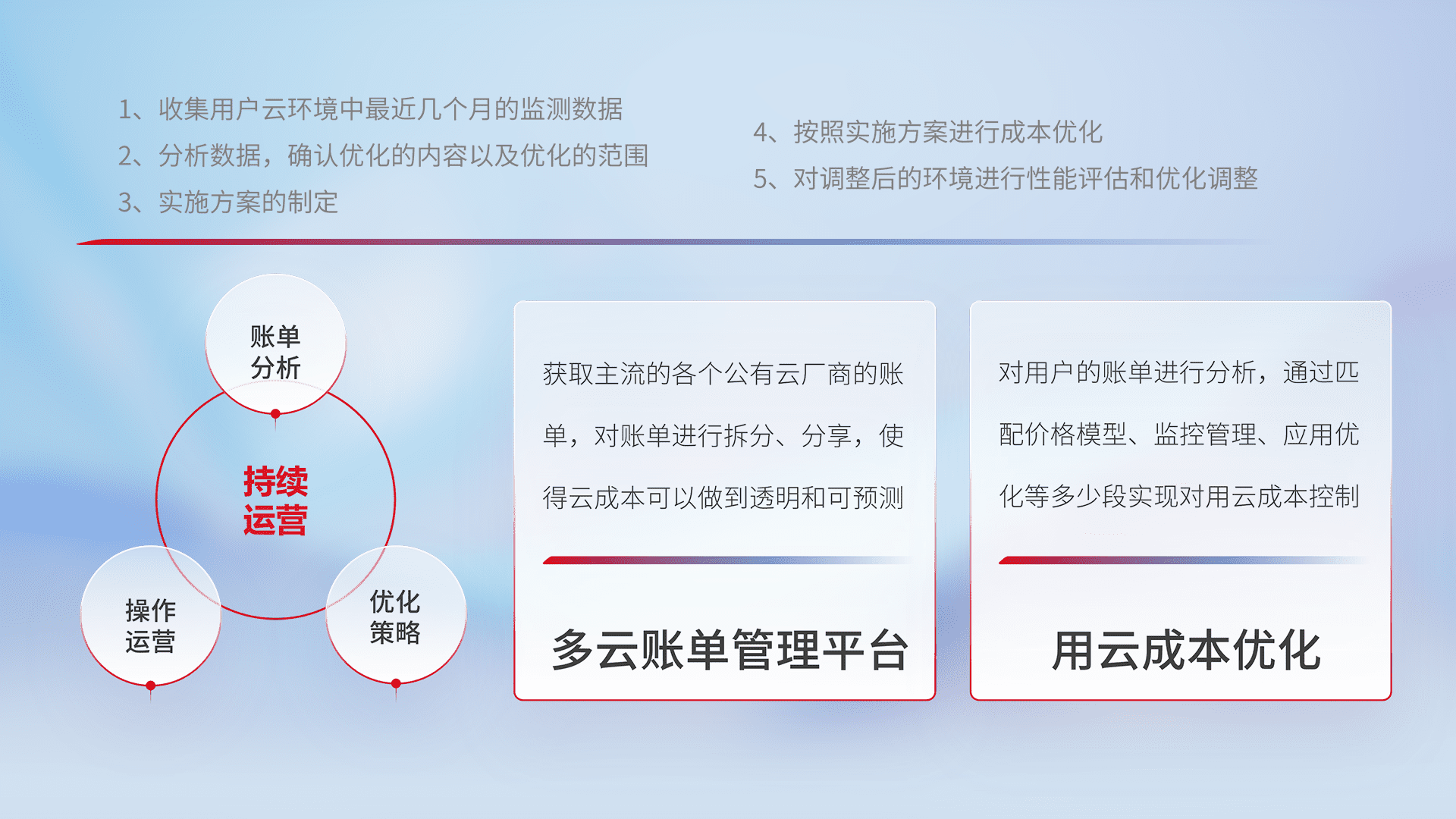 通过多云纳管,,,,以统一的资源数据模型把客户的云资源进行抽象和封装,,,,进而实现对多云资源的统一操作,,,保障云资源管理的可靠性、、稳定性与可用性。。。。量身定制化运维内容,,,,配置、、开发运维、、补丁管理、、、、备份、、监控、、认证和访问管理、、、、审计和日常巡检等,,,保障在用云过程中的可靠度,,,,稳定度以及高可用率。。。